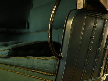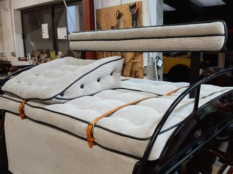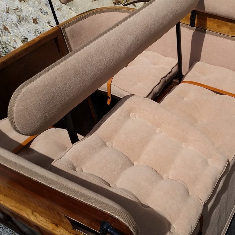Démontage complet afin de refaire les bois très abimés, traitement des métaux, peinture traditionnelle aux pinceaux ainsi que l'ensemble de la sellerie en drap de laine en conservant les passementeries d'origine. La capote en cuir et drap de laine a également était refaite, ainsi que les arceaux. Les garde-boue et pare-crotte en cuir ont été conservé, nettoyé et recoloré façon musée.